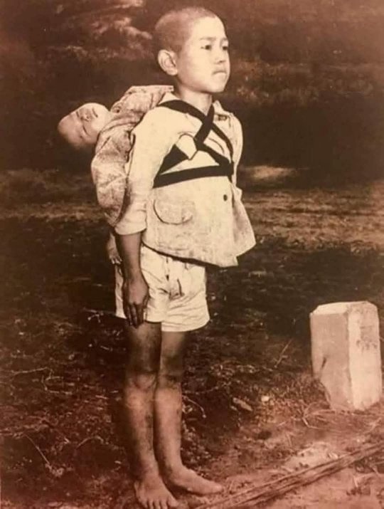 Trong thế chiến thứ hai, hình ảnh một cậu bé chân trần cõng đứa em trai đã chết trên lưng để tìm chỗ chôn cất đã được một phóng viên ghi lại. Con đường dài vắng tanh vì mọi người đều tìm nơi trú ẩn bom đạn, không ai nghĩ đến chuyện giúp cậu. Vã lại xác người còn nằm rãi rác khắp nơi. Một người lính nhìn thấy cậu bé và bảo cậu hãy vứt xác em trai đi để đi theo kịp đoàn người di tản nhưng cậu bé cương quyết trả lời: