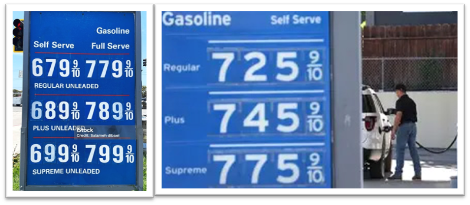 Giá xăng tại thành phố Los Angeles (hình bên trái) thấp hơn các thành phố phía Bắc California
