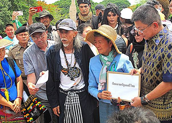 Hình 3: Một bản kiến nghị nhằm giải quyết vấn đề ô nhiễm đã được đệ trình lên Thứ trưởng Thường trực Bộ Nội vụ, ông Khajorn Srichanonthai (bên phải), trong một buổi lễ được tổ chức ngay giữa cây cầu bắc qua sông Kok đang bị ô nhiễm. [Nguồn: photo by Tom Fawthrop].
