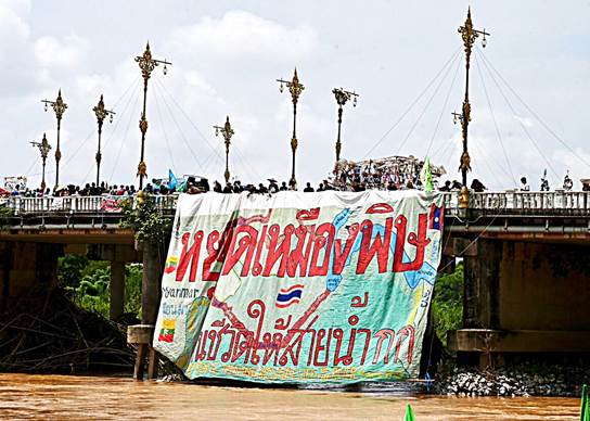 Hình 4: Trên cây cầu bắc qua sông Kok đang bị ô nhiễm, các viên chức chính phủ tiếp nhận một bản kiến nghị tại một cuộc biểu tình phản đối ô nhiễm. [Nguồn: Earth Thailand].