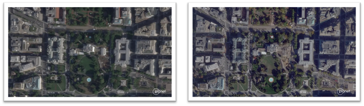 Tòa Bạch Ốc nhìn từ trên không: hình bên phải cho thấy Khu dinh thự phía Đông đã không còn.