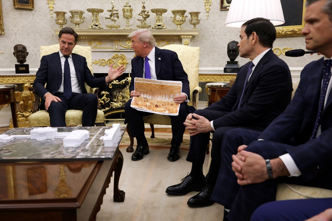 Tổng thống Donald Trump ‘khoe’ bản mô khu dinh thự phía đông của Nhà Trắng khi gặp Tổng thư ký NATO Mark Rutte (bên trái) tại Phòng Bầu dục vào thứ Tư 12/10. (Ảnh: Alex Wong/Getty Images)