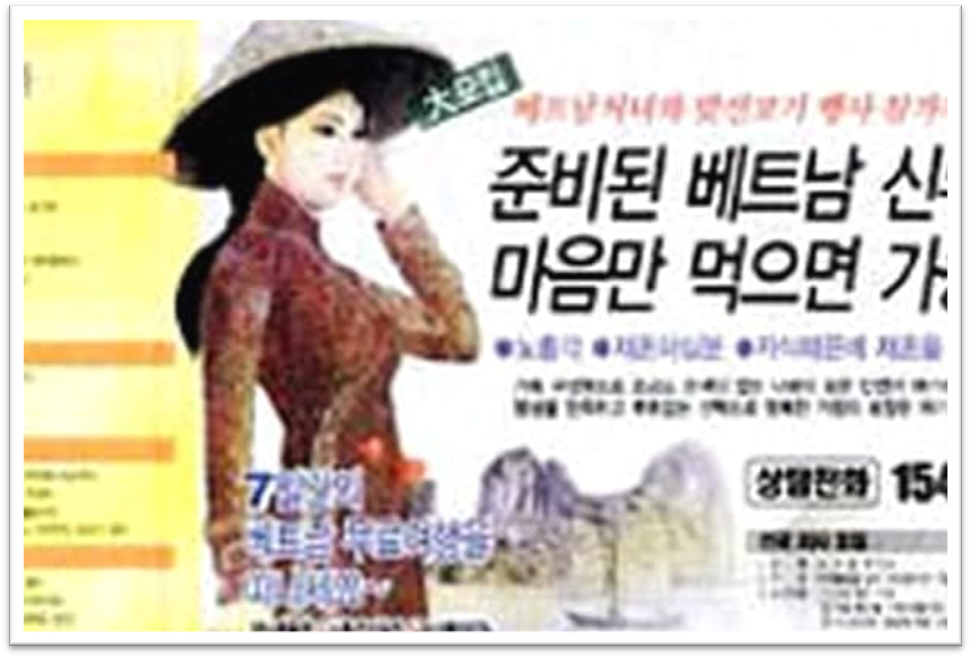 [1] Ông Kim Hee-soo, Thị trưởng quận Jindo bên Nam Hàn, nói rằng: “young Vietnamese women should be imported to marry rural bachelors” (“Nên nhập cảng phụ nữ Việt Nam trẻ để kết hôn với những đàn ông độc thân ở nông thôn”).