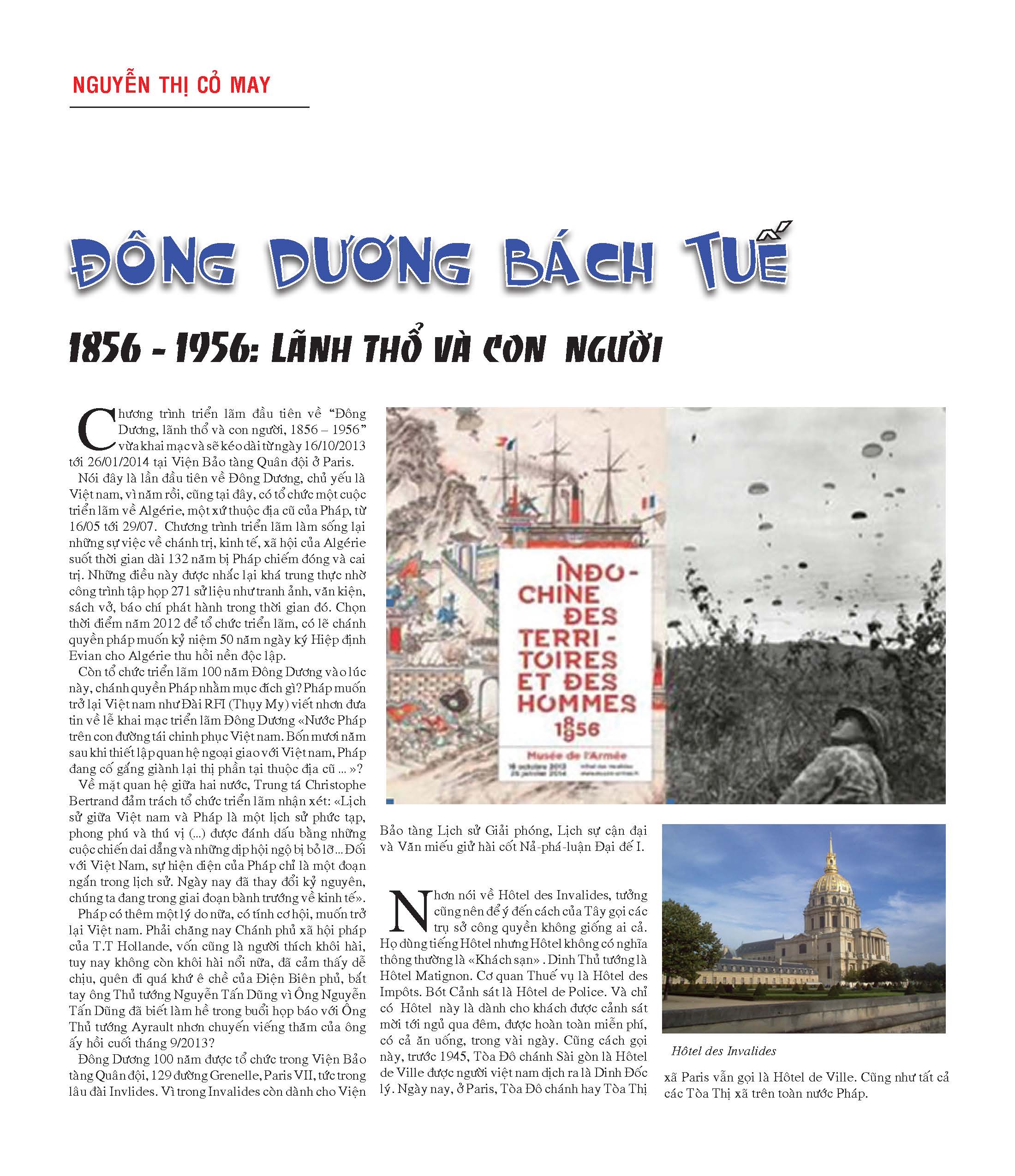 Chương trình triển lãm đầu tiên về “Đông Dương, lãnh thổ và con người, 1856 – 1956” vừa khai mạc và sẽ kéo dài từ ngày 16/10/2013 tới 26/01/2014 tại Viện Bảo tàng Quân đội ở Paris.Nói đây là lần đầu tiên về Đông Dương, chủ yếu là Việt nam, vì năm rồi, cũng tại đây, có tổ chức một cuộc triển lãm về Algérie, một xứ thuộc địa cũ của Pháp, từ 16/05 tới 29/07. Chương trình triển lãm làm sống lại những sự việc về chánh trị, kinh tế, xã hội của Algérie suốt thời gian dài 132 năm bị Pháp chiếm đóng và cai trị. Những điều này được nhắc lại khá trung thực nhờ công trình tập họp 271 sử liệu như tranh ảnh, văn kiện, sách vở, báo chí phát hành trong thời gian đó. Chọn thời điểm năm 2012 để tổ chức triển lãm, có lẽ chánh quyền pháp muốn kỷ niệm 50 năm ngày ký Hiệp định Evian cho Algérie thu hồi nền độc lập. -
