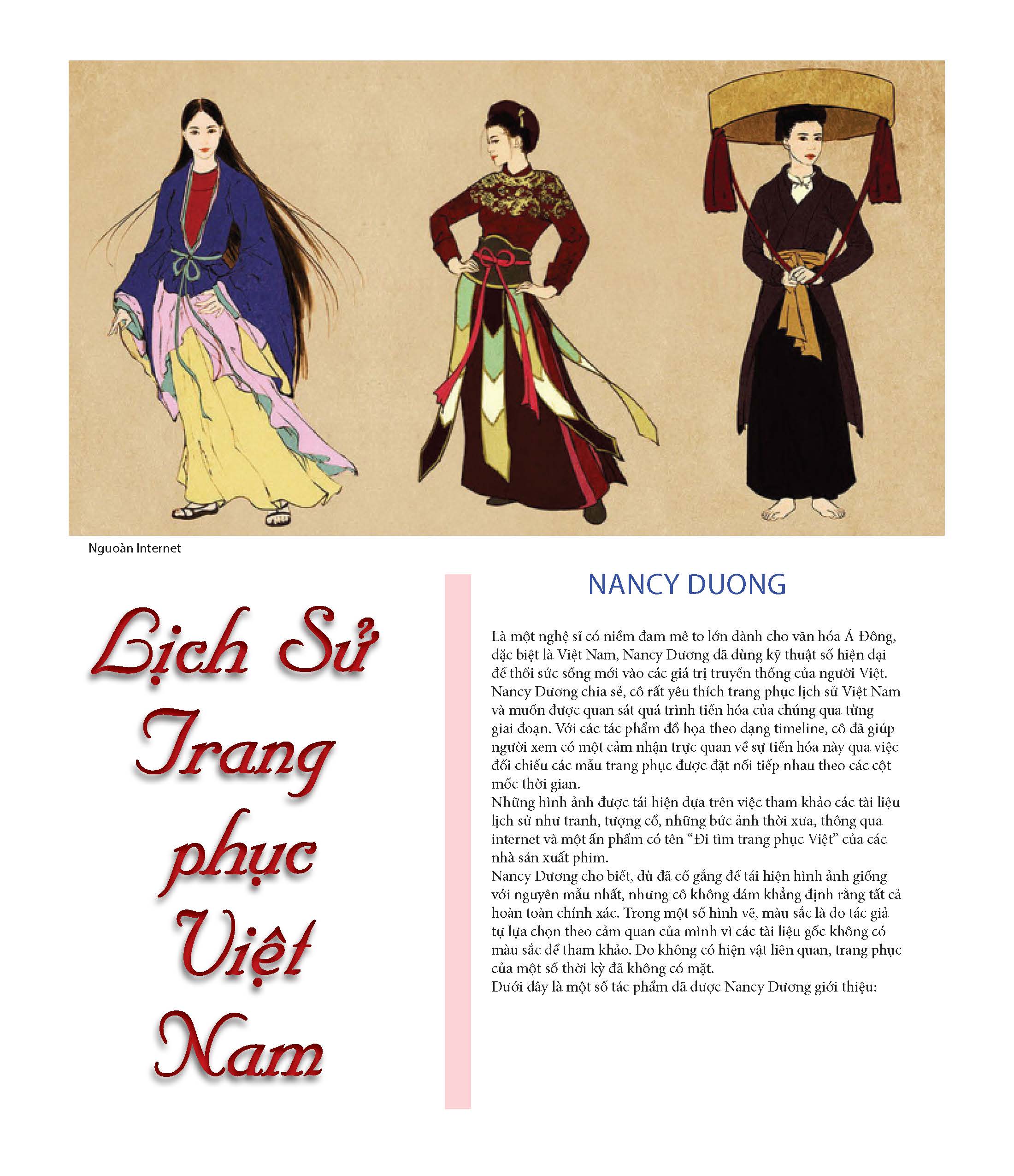 Là một nghệ sĩ có niềm đam mê to lớn dành cho văn hóa Á Đông, đặc biệt là Việt Nam, Nancy Dương đã dùng kỹ thuật số hiện đại để thổi sức sống mới vào các giá trị truyền thống của người Việt. Nancy Dương chia sẻ, cô rất yêu thích trang phục lịch sử Việt Nam và muốn được quan sát quá trình tiến hóa của chúng qua từng giai đoạn. Với các tác phẩm đồ họa theo dạng timeline, cô đã giúp người xem có một cảm nhận trực quan về sự tiến hóa này qua việc đối chiếu các mẫu trang phục được đặt nối tiếp nhau theo các cột mốc thời gian.Những hình ảnh được tái hiện dựa trên việc tham khảo các tài liệu lịch sử như tranh, tượng cổ, những bức ảnh thời xưa, thông qua internet và một ấn phẩm có tên “Đi tìm trang phục Việt” của các nhà sản xuất phim.Nancy Dương cho biết, dù đã cố gắng để tái hiện hình ảnh giống với nguyên mẫu nhất, nhưng cô không dám khẳng định rằng tất cả hoàn toàn chính xác. Trong một số hình vẽ, màu sắc là do tác giả tự lựa chọn theo cảm quan của mình vì các tài liệu gốc không có màu sắc để tham khảo. Do không có hiện vật liên quan, trang phục của một số thời kỳ đã không có mặt.Dưới đây là một số tác phẩm đã được Nancy Dương giới thiệu: -