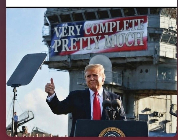 Thử tưởng tượng nhân loại vào thế kỷ 21 đã có một nhân vật quyền lưc nhất thế giới ăn nói y hệt như một học sinh lớp 4 đã khởi động một cuộc chiến tranh đưa toàn thể thế giới vào bờ vực phá sản về kinh tế, trầm trọng hơn cả trong mùa đại dịch Covid chưa đủ làm nhân loại kinh hoàng thì hãy chấp nhận thêm một thực tế là những người Hoa Kỳ ủng hộ ông trước đây vẫn tiếp tục ủng hộ ông: một trong những lý do là bởi họ hiểu được những lời nói “thùng trổng kêu to” lảm nhảm vô nghĩa này của ông. Đã Very Complete thì không thể … Pretty Much được. Đó cũng là lý do ông thú nhận ông yêu những người ít học. Đó là lời của ông ấy, chứ không phải của tôi. Ông là vị tổng thống đầu tiên mà những người này có thể đồng cảm mà chẳng cần đến từ điển hay văn phạm.