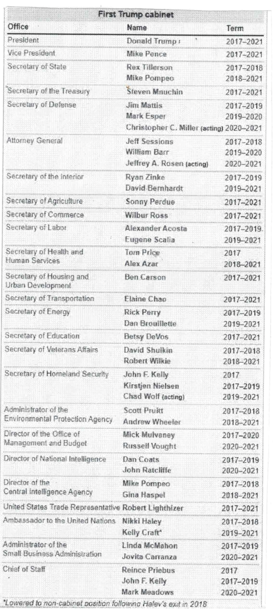 Nhiệm kỳ đầu của ông Trump, mọi người vẫn chưa biết rõ cá tính, con người và sự hiểu biết của ông về chính trị, về danh dự đất nước, về hiến pháp Hoa Kỳ và về lịch sử thế giới nên rất nhiều người có uy tín và thành tích về quân sự, về kỷ nghệ, về tài chính đã tham gia nội các của ông: