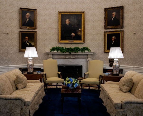 Đây là hình ảnh Phòng Bầu Dục dưới thời Biden. Giấy dán tường được thay trong nhiệm kỳ đầu tiên của Trump vẫn được tổng thống Biden giữ nguyên. Chỉ thay bàn ghế, tranh ảnh của các vị tổng thống tiền nhiệm và màu thảm rất đậm.