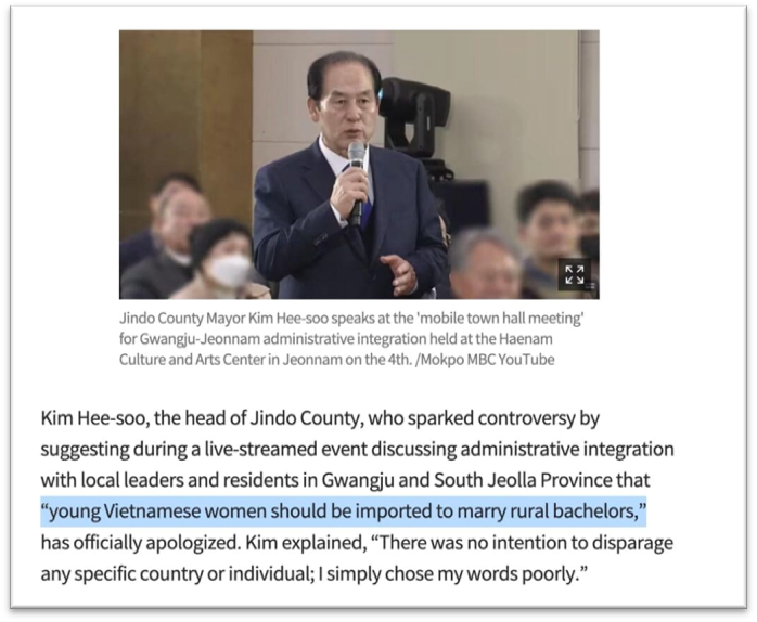 [1] Ông Kim Hee-soo, Thị trưởng quận Jindo bên Nam Hàn, nói rằng: “young Vietnamese women should be imported to marry rural bachelors” (“Nên nhập cảng phụ nữ Việt Nam trẻ để kết hôn với những đàn ông độc thân ở nông thôn”).