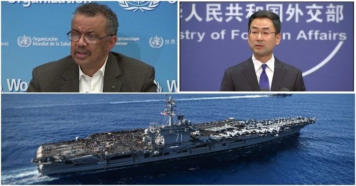Tổng giám đốc WHO Tedros Adhanom Ghebreyesus (trái), Người phát ngôn Bộ Ngoại giao Trung Cộng Cảnh Sảng (phải), Tàu USS Bunker Hill