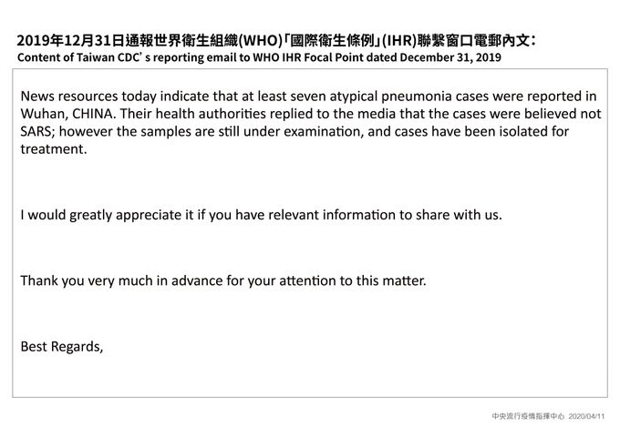 WHO phủ nhận việc Đài Loan từng cảnh báo tổ chức này về sự lây truyền virus từ người sang người. Tuy nhiên, CDC của Đài Loan nói rằng họ đã sử dụng cụm từ “viêm phổi không điển hình” – giống như dịch SARS trước đây, vốn lây từ người sang người – nên “các chuyên gia y tế có thể nhận thức được việc dùng cụm từ này có nghĩa là, bệnh dịch có thể lây từ người sang người”, theo thông cáo báo chí của CDC Đài Loan.