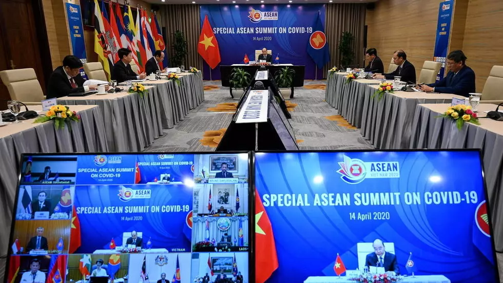 Thủ tướng VC Nguyễn Xuân Phúc trong hội nghị truyền hình với các nhà lãnh đạo ASEAN về dịch virus corona tại Hà Nội ngày 14/04/2020. © Manan Vatsyayana/Pool via REUTERS