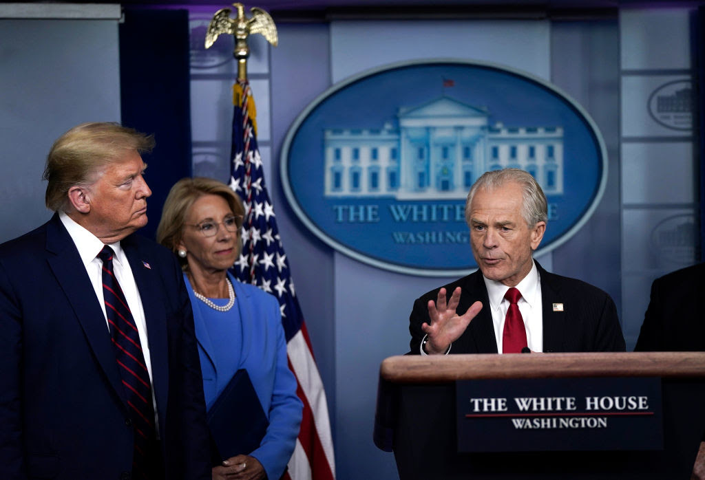 Cố vấn Tòa Bạch Ốc Peter Navarro phát biểu, đứng bên cạnh là Tổng thống Trump và Bộ trưởng Giáo dục Betsy DeVos, tại cuộc họp báo về đại dịch Covid-19 ở Washington D.C