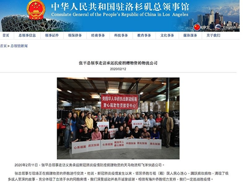 Vào ngày 14/2, Tổng lãnh sự quán Trung Cộng tại Los Angeles đã ban hành "Chỉ thị mới nhất về các vật tư quyên góp", cập nhật thông tin về các vật tư y tế cần thiết và vận chuyển hàng quyên góp, đưa ra "gợi ý" cho các nhà tài trợ để lựa chọn và mua vật tư.